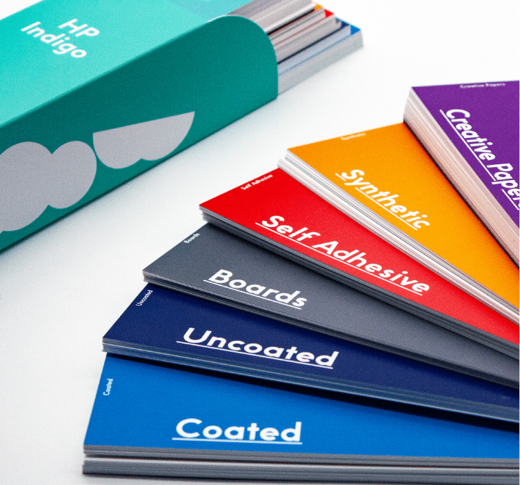 Swatches Still Matter in a Digital World. Screens can’t replicate tactility and PDFs can’t show how ink lays on texture. A HP Indigo-specific swatch gives you a truthful, physical reference – how colours render, how text reads at small sizes, and how surface character affects perceived saturation.