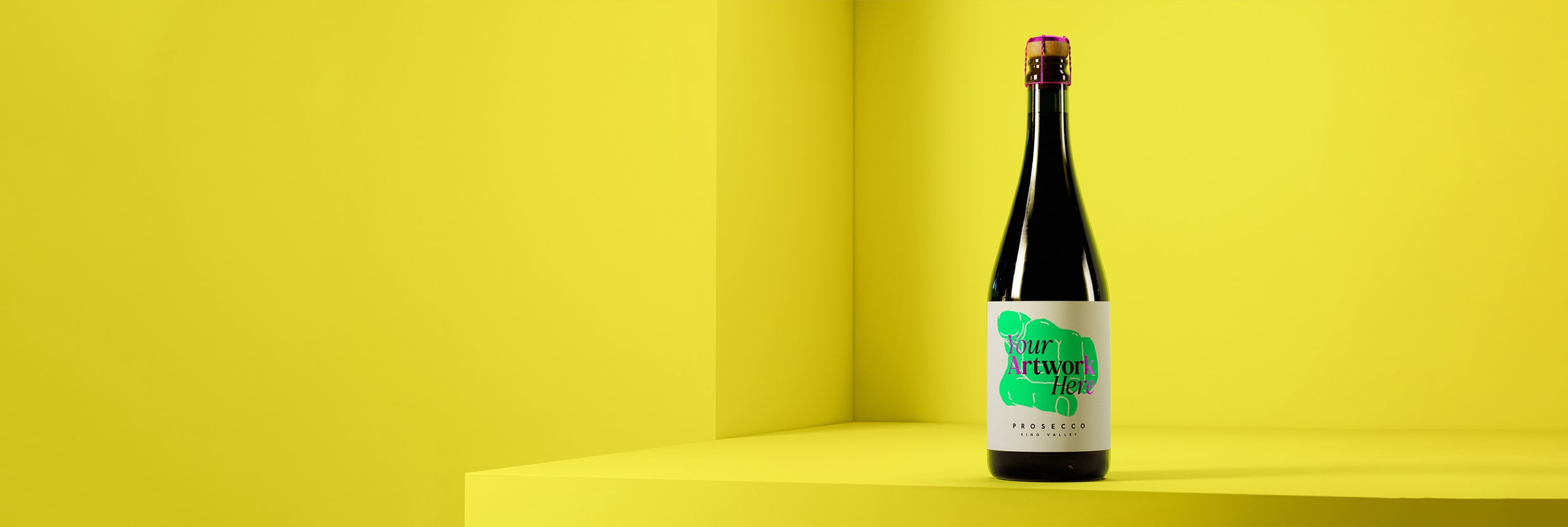 Photorealistic mockup of a Champagne bottle with a curated collection of 12 premium facestocks built-in, with foil and embossing functionality, dynamic colour change and automated light bounce.