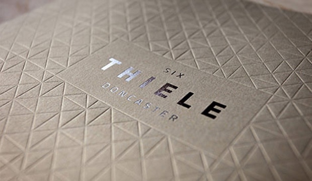 The cover is printed offset on Curious Metallics in Gold Leaf 300gsm. No ink was used on the cover. Instead, a full blanket blind deboss of the brand’s geometric motif (inspired by the architecture designed by award-winning architect Clarke Hopkins Clarke), has been impressed across the entire surface to create a stunning tactile experience. As a final touch of opulence, Six Thiele Doncaster’s bold logotype was centrally embellished using Milford Astor silver foil for a striking and eye-catching contrast.
